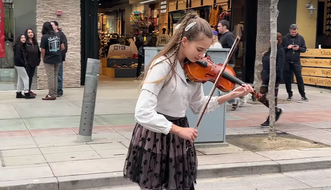 Karolina can often be found playing pop music on her violin by shops near the Santa Monica Pier in California. She doesn't just stand in one place. Instead she puts her music in motion with some dance moves she may have learned in ballet or other dance classes. Or maybe she moves as the music inspires her. She performs covers of well known pop and rock music but also wows with her ability to perform some difficult classical pieces (at recitals, not on the pier). She said in an interview she likes the music she performs on the pier because it gives her the freedom to move around.